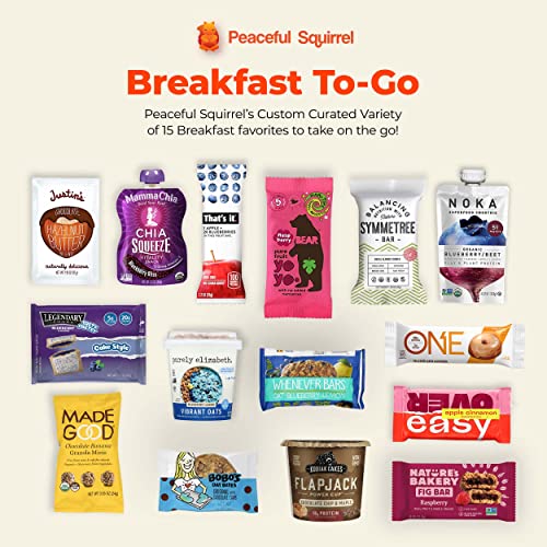 - HEALTHY BREAKFAST TO-GO : Peaceful Squirrel's Custom Curated Breakfast To-Go Variety Box is filled with all of your favorite morning snacks to take with you. Curation includes a balanced variety of delicious and nutritious bites from premium brands that are perfect to grab for your morning on the go. Includes a free reusable tote bag!