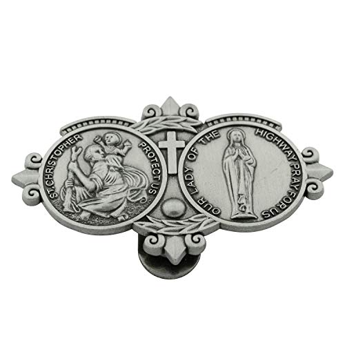 - LOVELY DESIGN - This beautiful visor clip features Saint Christopher carrying the Christ Child and Mary. It is inscribed with the prayer "St. Christopher Protect us, Our Lady of the Highway Pray for Us".
